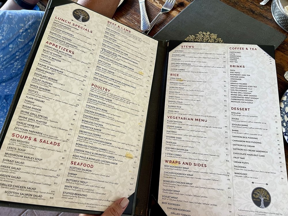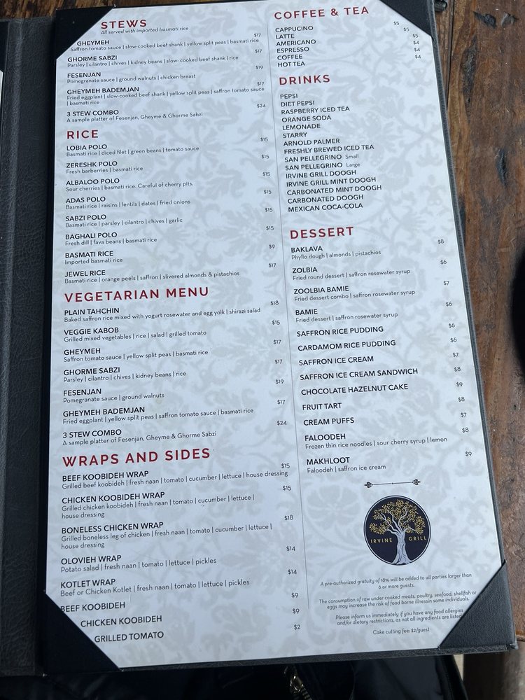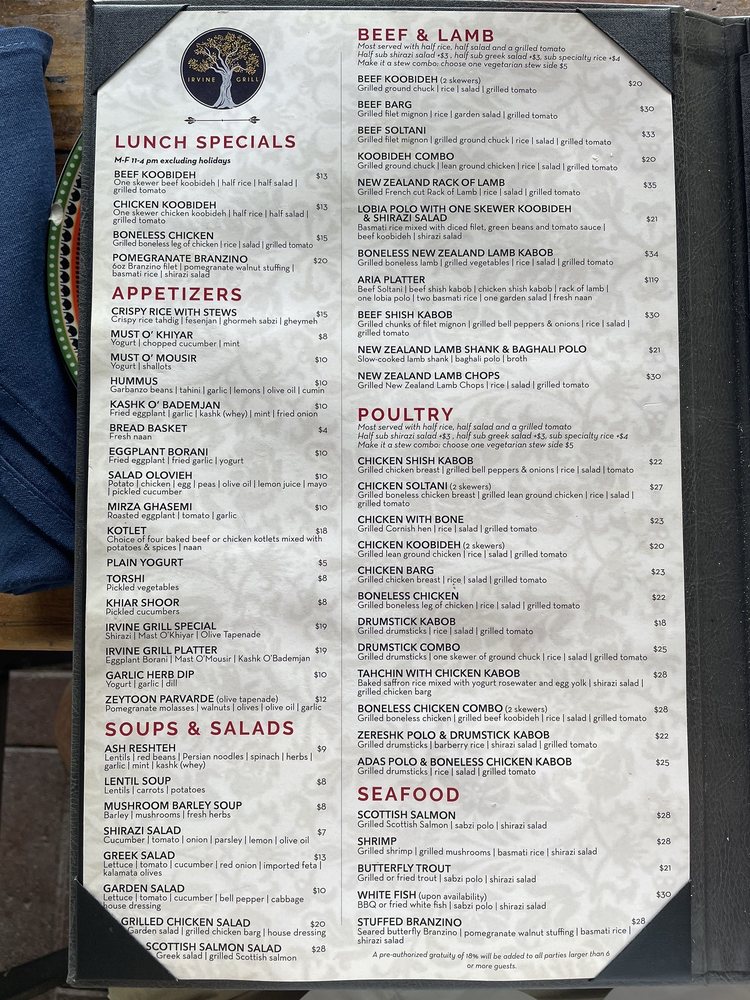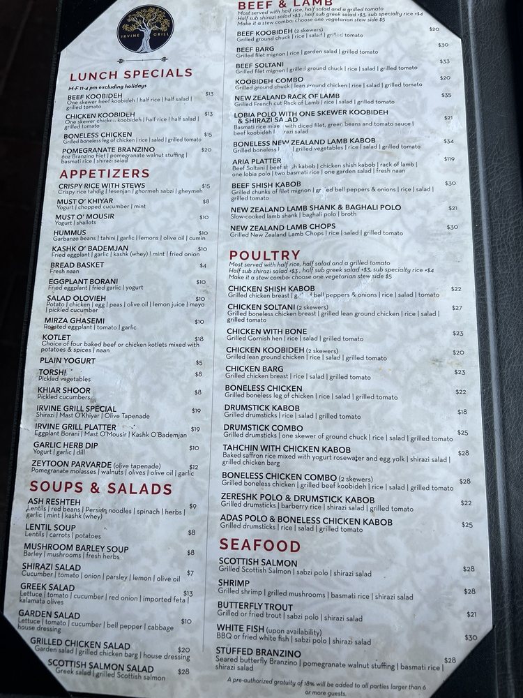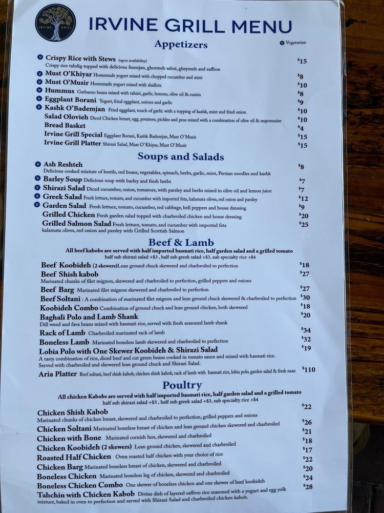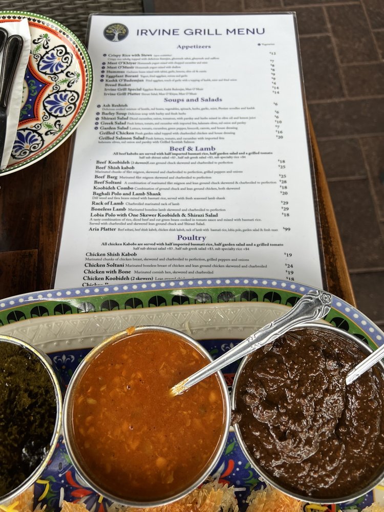 Welcome to Irvine Grill, a delightful Mediterranean haven nestled in Irvine, California. Specializing in Persian and Iranian cuisines, this charming spot offers a culinary journey from the heart of the Mediterranean to your plate. The menu showcases a tantalizing array of dishes, such as the Eggplant Borani and sumptuous Chicken Soltani, skewered to perfection. Each meal is crafted with care, balancing bold flavors with organic ingredients.